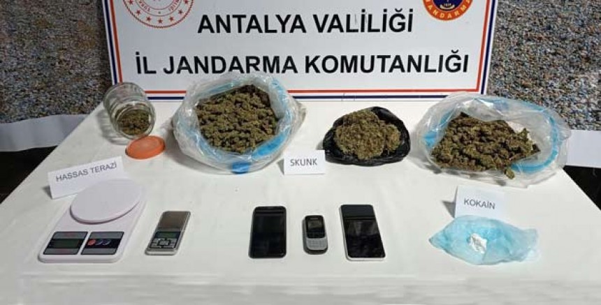 Antalya Valiliği İl Jandarma Komutanlığı, uyuşturucu madde imal ve ticaretine yönelik başarılı çalışmalarına tüm hızıyla devam ediyor. Antalya Cumhuriyet Başsavcılığı talimatları doğrultusunda; uyuşturucu madde imal ve ticaretine yönelik Antalya İl Jandarma Komutanlığına bağlı İstihbarat Şube Müdürlüğü ve Kepez İlçe Jandarma Komutanlığı ekipleri ile birlikte yürütülen çalışmalar kapsamında; N.D., C.D. ve S.G. isimli şahısların temin ettikleri uyuşturucu maddeyi,Muratpaşa ilçesinde kiraladıkları evden piyasa sürecekleri tespit edildi. Şüphelilerin bulunduğu evde yapılan aramada; 4,150 gram skunk, 50 gram kokain, 2 adet hassas terazi ele geçirildi.